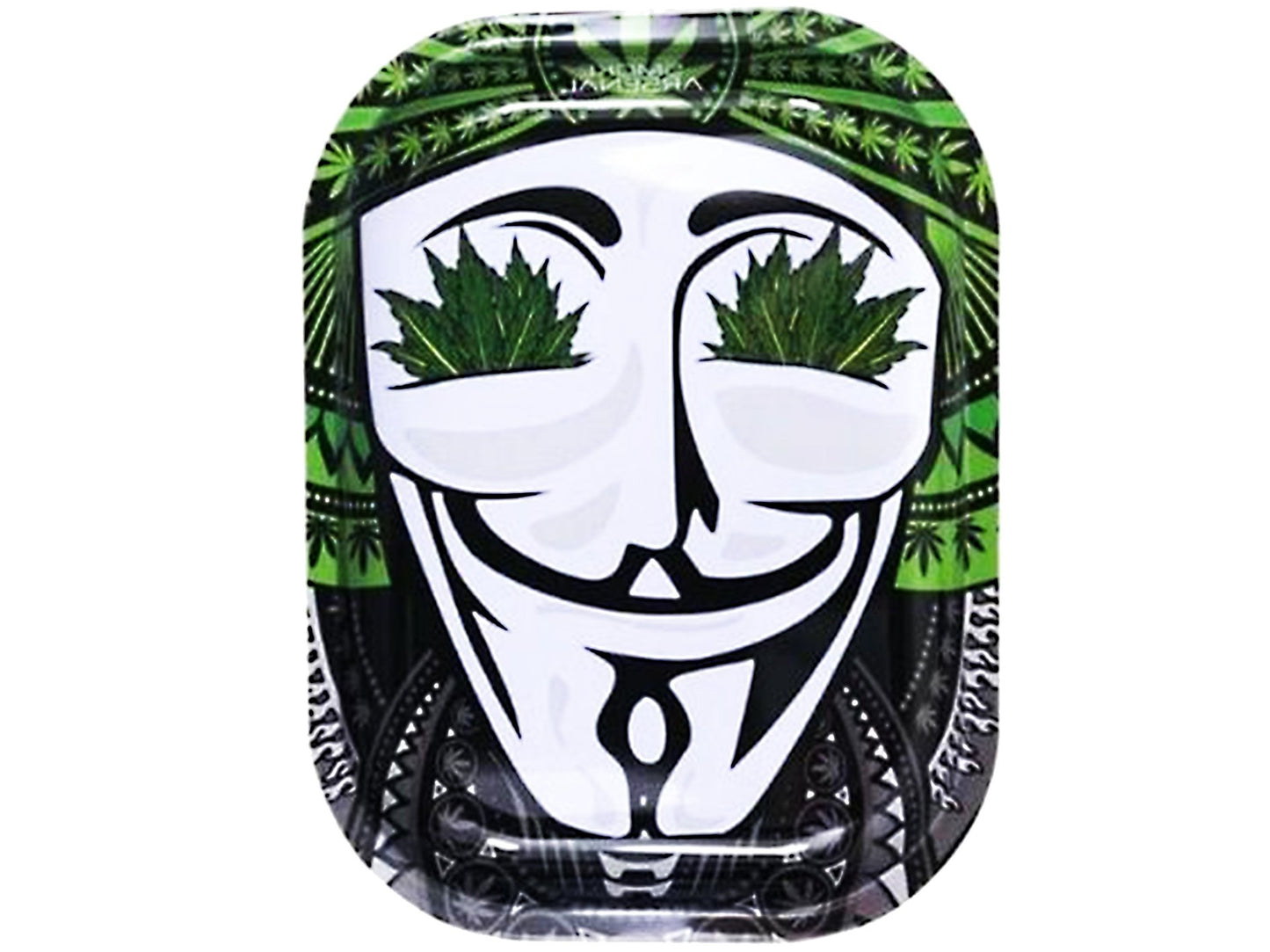 The "Expect Us" rolling tray from Smoke Arsenal features a design inspired by the Guy Fawkes mask, also known as the Anonymous mask. This stylized depiction of Guy Fawkes, created by illustrator David Lloyd for the 1982–1989 graphic novel V for Vendetta, has become a symbol of protest and anonymity.
