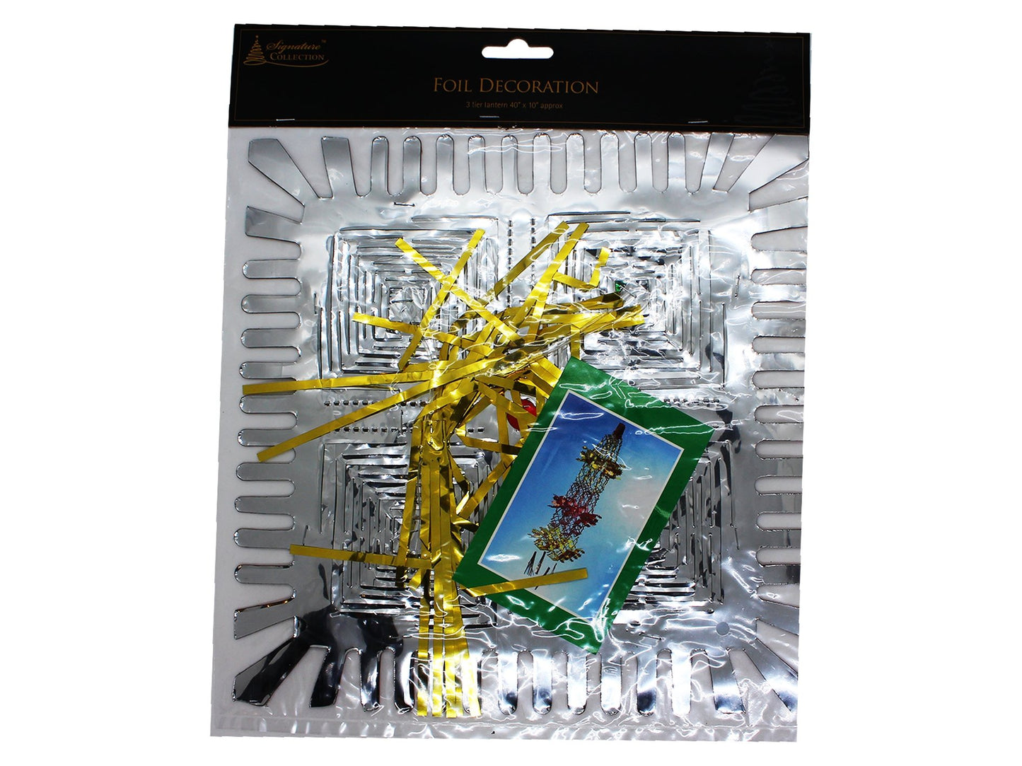 Illuminate your space with the stunning Foil Decoration 3-Tier Lantern. Standing at an impressive 40 inches tall and 10 inches wide, this lantern is the perfect addition to any celebration or décor setup. Its elegant, shimmering foil design adds a luxurious touch, making it ideal for parties, weddings, or even as a statement piece in your home.