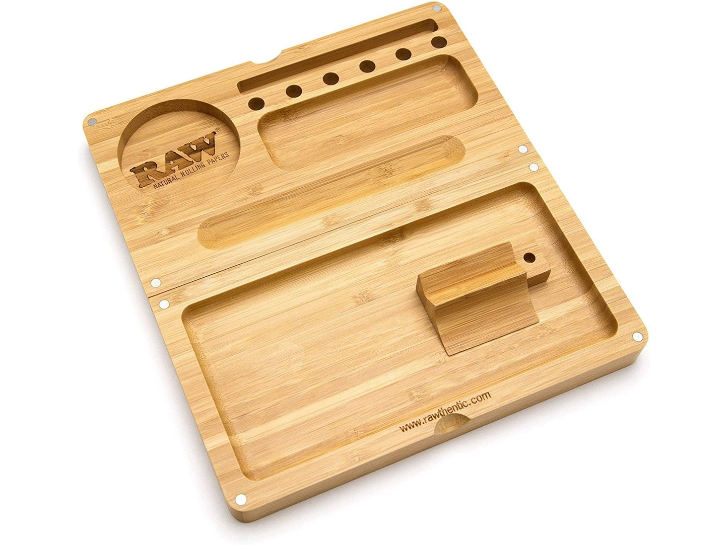 As plain as the exterior may be, what you find inside was inspired by a rolling tray from way back in the 1970s and will blow you away. One of the halves is dominated by an indentation that takes up almost all of the surface - obviously the part for mixing your smoking blend in and rolling your joint above. Nifty extra: The scooper/cradle. The other half offers compartments for a grinder, rolling papers, tips and lots more, to put it simply, all you need for rolling.