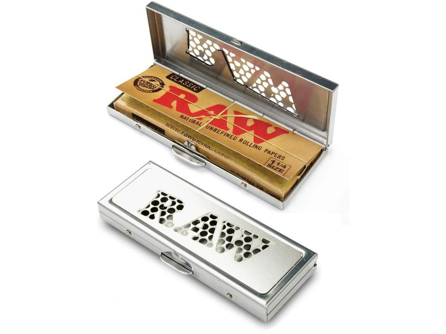 RAW Shredder Case- wide enough to hold a Raw 300 or Raw Artisano 1 1/4 sheet of rolling paper so you can grind right into it. No fuss, no mess! Case includes a catch closure that opens with the press of your thumb.