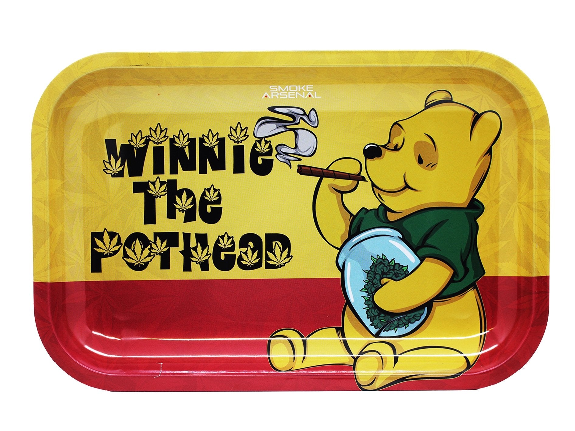 Enhance your smoking sessions with the Winnie The Pot Head rolling tray from Smoke Arsenal. This tray features a playful design inspired by the beloved Winnie the Pooh character, adding a whimsical touch to your collection. Crafted from premium metal, it ensures durability and easy maintenance, making it ideal for both home and on-the-go use.